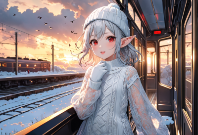 wink children elf and young elf,8K,((masterpiece,best quality,Ultra extremely detailed,perfect anatomy,detailed,high resolution,detailed clothing,highres)),((close-up eyes,flower print,children female elf wearing see-through sweater dress ,see-through sleeves, frill Knit skirt,white knit glove)),looking at viewer,((closing one eye, winking red Eye, Eye Reflections, reflect strong highlight in eyes)),waving shining long inner color white hair,hair_band,red Eye, eye catch,winking,wink,elf ear,opening mouth,mile,blush,lipstick,full fresh lips,big hip,small breasts,white knitted hat,BREAK,in train,many birds,clouds,dark clouds,flushing lightning ,strong wind,steam train ,reflecting view of rail road and station,in the blizzard,sunset,<lora:hairdetailer:0> <lora:make25d_type1_v100:1> ,,,,