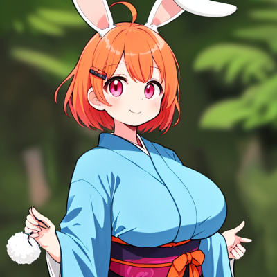 ((1 rabbit girl)),((solo)),looking at viewer,smile,short hair,bangs,hair ornament,((animal ears)),((upper body)),ahoge,japanese clothes,hairclip,pink eyes,kimono,((orange hair)),((rabbit ears)),sash,wavy hair,obi,yukata,blue kimono,((gigantic breasts)),standing,(height 1.45meters)