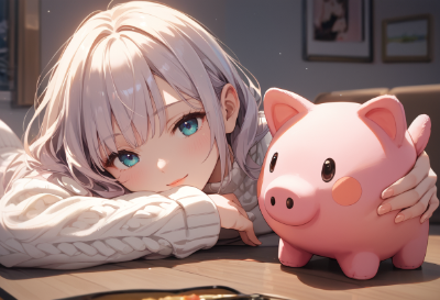 1girl,lying on stomach,white sweater,holding piggy-bank,from front,close up,looking at bank,