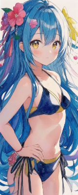 kawaii,soft light,watercolor,long hair,a girl,yellow eyes,blue hair,anime style,(masterpiece, best quality, top quality, high_resolution:1.2),Japanese confectionery,eat,triangle bikini,kawaii,soft light,watercolor,long hair,a girl,yellow eyes,blue hair,anime style,(masterpiece, best quality, top quality, high_resolution:1.2),lustrous skin,hands on own hips, <lora:hyperdetailer_v060:1> <lora:Lineart-v2:1> ,