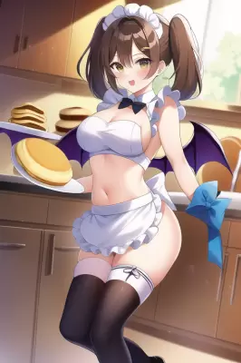 masterpiece, best quality, leaning to the side, Dynamic angles,long knee highs, large breasts,{{{{official art}}}}, lens flare, {{{{{{{famous artist}}}}}}}, {{{{maid girl}}}}, demon wings, (fusion of miko and maid in front of navel),{{{{solo}}}}, {{twintails}}, {{{brown hair}}}, {{{Pancake}}}, {holding a fork}, {{kitchen}},#