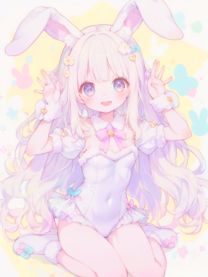 bunny girl, rabbit ears, lop-eared, fluffy, bunny suit, leotard, Rabbit pose, hands up, wrist cuffs, smile, pastel tone,