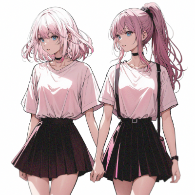 (blurry background:1.3), (RGB Noise:1.3), (Pink background:1.3), (extremely detailed fine touch:1.3), (hard light, studio light, light rays, dappled light, reflection, shadows, ray tracing:1.0), ///, Pink background, 2D dark manga style color line drawing sketch for adults, highly finished super detailed 8K vibrant pen sketch, girl with long black hair and twin tails, black t-shirt, red long skirt, sneakers, brick wall