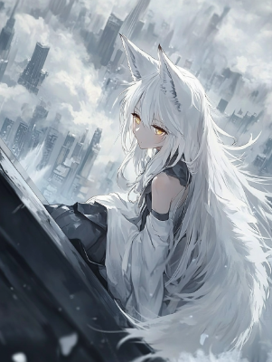 anime, flat colors, crayon drawing, wide wild world,old new town, wind blast, burst, killer queen, beautiful cool dark-skinned girl, white japanese miko clothes, silk texture, black undershirt, white hair, fox ears, thick eyebrows, magnificent scene, blur, blur, blur, plane background, on the huge classical city,