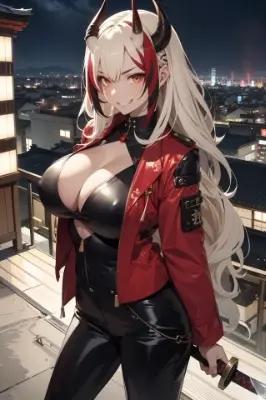 Lama-cleanerで修正あり parameters flat color, pencil (sketch:1.3) ukiyo-e tachi-e fine art parody, expression, posture, gesture, (absurdres:1.2) (brocade:1.5), high contrast,1woman, solo, beautiful face, oni horns, blonde and red ((streaked hair)), highlights hair, kimono, (Leather pants:1.1), jacket, evil grin, huge breasts, long hair, moon, <lora:hair_with_scenery:1>, <lora:flat2:1> Negative prompt: EasyNegativeV2 Steps: 20, Sampler: Euler, CFG scale: 7, Seed: 749275667, Size: 1024x1024, Model hash: 0805b136eb, Model: breakdomain_M2150, Denoising strength: 0.4, Clip skip: 2, Version: v1.2.1, Tiled Diffusion upscaler: 4x-AnimeSharp, Tiled Diffusion scale factor: 1.30612245, Tiled Diffusion: \"{\'Method\': \'MultiDiffusion\', \'Tile tile width\': 96, \'Tile tile height\': 96, \'Tile Overlap\': 48, \'Tile batch size\': 1, \'Upscaler\': \'4x-AnimeSharp\', \'Upscale factor\': 1.30612245, \'Keep input size\': True, \'NoiseInv\': True, \'NoiseInv Steps\': 10, \'NoiseInv Retouch\': 1, \'NoiseInv Renoise strength\': 1, \'NoiseInv Kernel size\': 64}\"