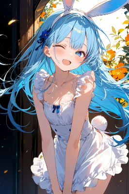 masterpiece, best quality, extremely detailed, (illustration, official art:1.1), 1 girl ,(((( light blue long hair)))), ,(((( light blue long hair)))),light blue hair, , long hair ((blush)) , cute face, big eyes, masterpiece, best quality,(((((a very delicate and beautiful girl))))),Amazing,beautiful detailed eyes,blunt bangs((((little delicate girl)))),tareme(true beautiful:1.2), sense of depth,dynamic angle,,,(((tareme))), (true beautiful:1.2),,(tiny 1girl model:1.2)(flat chest) 、masterpiece, top quality, very aesthetic, absurd, (super detailed), vivid, (nice hands, perfect hands), ideal proportions of the body, BREAK (vector outline, flat colors: 1.5), (one girl), solo, standing, (hugging white rabbit: 1.2), from the side, upper body close-up, (colorful floral background), BREAK cute girl, 18 years old, detailed blue eyes, (eye highlights), bright smile, (eyes closed: 1.2), wide open mouth, (blush all over face), floating hair, BREAK (wearing a shiny white maid: 1.2), (white rabbit ears headband and white rabbit tail), white thigh-high socks, white pumps <lora:flat2:1> <lora:sensualface_type2:1>