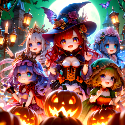 (4girls, cute loli gyaru, naked halloween skimpy cosplay, lady Satan, lady knight, lady mummy, lady bat, lady skeleton), well-fleshed shiny skin, sparkling dark eyes, sphere earrings