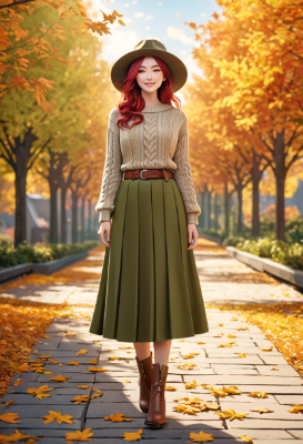 [ultra-realistic 4K rendering, Instagram-worthy, fall-themed photoshoot] A stunning woman with long flowing red hair, with a very human and lifelike face, wearing a cozy outfit consisting of a warm beige cable-knit sweater, a pleated olive green skirt, and a stylish brown belt. She is accessorized with a matching olive green hat, a leather shoulder bag, and sleek tan ankle boots. The background reflects the autumn season, with golden leaves scattered on the ground and a warm, inviting atmosphere. The woman is smiling warmly at the camera, full length, standing on a rustic path surrounded by soft, diffused natural light, captured in a high-resolution shot that highlights every detail, ultra-sharp focus.