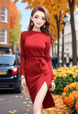 ((best-quality、8k、masterpiece)), full body, long legged, sharp focus, Beautiful woman with perfect body shape, Slender Abs:1.1, (She is wearing a autam color fluffy sweater dress with an turtleneck., mideam breasts, Slender and toned hips, Soft looking big buttocks, sticking out his chest and smiling), Highly detailed facial and skin texture, A detailed eye, double eyelid, a 26yo woman, Mature woman,tendaly smile,extremely beautiful and fain design,((extremely fine and beautiful colors)) ,((amazing sapraizz)), ((dynamic production)), cinematic lighting,gravia ,bobcut,blue eyes,autumn,city ,walking, <lora:saturation:1> <lora:make25d_type4_v100:1>,Autumn coordination