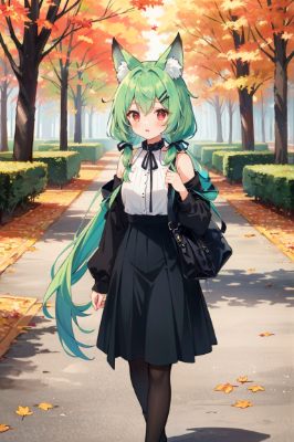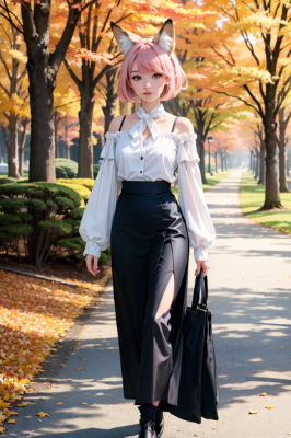 girl,bobcut,red hair,red eyes,Autumn coordination,fox girl,original character,fantasy,cyberpunk,autumn,day,different world,park(A beautiful girl with fox ears is walking in a park dyed in autumn colors, wearing a white long-sleeved blouse with slightly exposed shoulders that suits the autumn season, and a long skirt.)