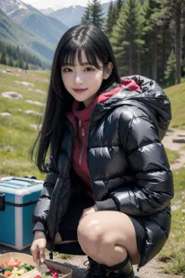 (photorealistic:1.4), (RAW photo), masterpiece, best quality, extremely detailed, lady, elegant, neat and clean, shiny, glossy, short down jacket, (shawl collar:1.3), hood, mini skirt, knee high boots, (wedge sole:1.2), almond shaped drooping eyes, smile, staring, black hair, in the park, (low angle:0.7), <lora:hime_style-1.0r8:0.8>,