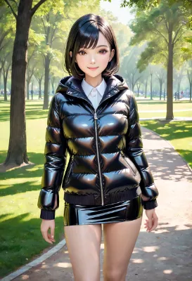 (photorealistic:1.4), (RAW photo), masterpiece, best quality, extremely detailed, lady, elegant, neat and clean, shiny, glossy, short down jacket, (shawl collar:1.2), hood, mini skirt, knee high boots, wedge sole, almond shaped drooping eyes, smile, staring, black hair, in the park, (low angle:0.7), <lora:hime_style-1.0r8:0.8>,