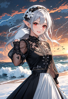 4K,8K,(sharp focus:1.5),((masterpiece,best quality,Ultra extremely detailed,perfect anatomy,detailed,high resolution,detailed clothing,highres,extremely detailed)),((dutch angle,flower print,children female elf wearing see-through sweater dress ,see-through sleeves, frill Knit skirt,white knit glove)),looking at viewer,((closing one eye, winking red Eye, Eye Reflections, reflect strong highlight in eyes)),waving shining long inner color white hair,hair_band,red Eye,elf ear with big earrings,opening mouth,mile,blush,lipstick,full fresh lips,big hip,small breasts,white knitted hat,fishes earrings,jumping,BREAK,train on railload in distance,many birds,clouds,dark clouds,flushing lightning,snow field,strong wind,beach side near sea,sunset, <lora:hairdetailer:1> <lora:make25d_type1_v100:1> ,