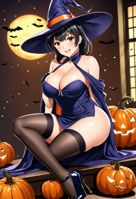 masterpiece, best quality, extremely detailed, anime, 1adult woman, takao (kancolle), solo, black hair, red eyes, witch hat, short hair, cleavage, black thighhighs, large breasts, blush, naughty smile, halloween Bodycon dress, offshoulder, garters, high heels, large ass, thong, cloak, navy base, halloween