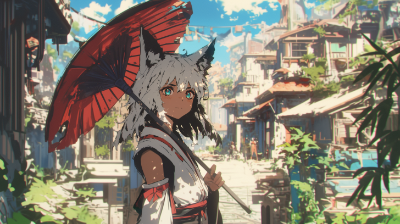 anime, flat colors, crayon drawing, cinematic lighting,old new town, wind blast, burst, killer queen, beautiful cool dark-skinned girl, white japanese miko clothes, silk texture, black undershirt, white hair, fox ears, thick eyebrows, magnificent scene, blur, blur, blur, simple white background, on the huge tropical city,