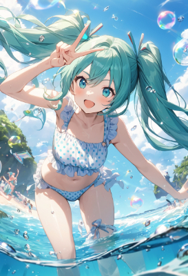 masterpiece, best quality, extremely detailed, anime, girl, ,1girl, v-signHatsune Miku, vocaloid, 1girl, twin tails, long hair, blue hair, green hair, blue eyes, 1girl, v-sign, Hatsune Miku in a polka dot bikini swimsuit playing in the water at the beach of Tokonatsu Island. Clear blue seas and blue skies. soap bubbles, fantastic, paradise,twintail,longhair,dream
