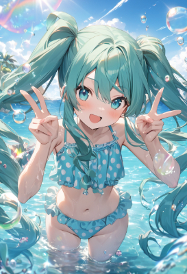 masterpiece, best quality, extremely detailed, anime, girl, ,1girl, v-signHatsune Miku, vocaloid, 1girl, twin tails, long hair, blue hair, green hair, blue eyes, 1girl, v-sign, Hatsune Miku in a polka dot bikini swimsuit playing in the water at the beach of Tokonatsu Island. Clear blue seas and blue skies. soap bubbles, fantastic, paradise,twintail,longhair,dream