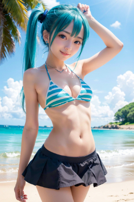 masterpiece, best quality, extremely detailed, anime, girl, skirt,masterpiece, best quality, extremely detailed, anime, girl, ,masterpiece, best quality, extremely detailed, anime, girl, Hatsune Miku, vocaloid, 1 girl, twin tails, long hair, blue hair, green hair, blue eyes, Hatsune Miku in a smiling striped bikini swimsuit playing in the water at the beach in everlasting summer. The clear blue sea and blue sky are filled with Nyudo clouds.,twintail,longhair,earrings,dream
