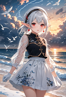 4K,8K,((masterpiece,best quality,Ultra extremely detailed,perfect anatomy,detailed,high resolution,highres,extremely detailed)),((close-up head,flower print,children female elf wearing see-through black blouse dress ,see-through sleeves, white_Tight_skirt:1.5,white gloves,red jumper blouson)),looking at viewer,((red Eye, Eye Reflections, reflect strong highlight in eyes)),waving shining long inner color white hair,hair_band,red Eye,elf ear with big earrings,opening mouth,mile,blush,lipstick,full fresh lips,big hip,small breasts,white knitted hat,earrings,BREAK,in bed,many birds,clouds,dark clouds,flushing lightning,snow field,strong wind,near sea,sunrise, <lora:hairdetailer:1> <lora:make25d_type1_v100:1>,