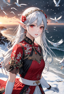 in bed,4K,8K,((masterpiece,best quality,Ultra extremely detailed,perfect anatomy,detailed,high resolution,highres,extremely detailed)),((close-up head,flower print,children female elf wearing see-through black blouse dress ,see-through sleeves, white_Tight_skirt:1.5,white gloves,red jumper blouson)),looking at viewer,((red Eye, Eye Reflections, reflect strong highlight in eyes)),waving shining long inner color white hair,hair_band,red Eye,elf ear with big earrings,opening mouth,mile,blush,lipstick,full fresh lips,big hip,small breasts,white knitted hat,earrings,BREAK,in bed,many birds,clouds,dark clouds,flushing lightning,snow field,strong wind,near sea,sunrise, <lora:hairdetailer:1> <lora:make25d_type1_v100:1>,