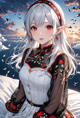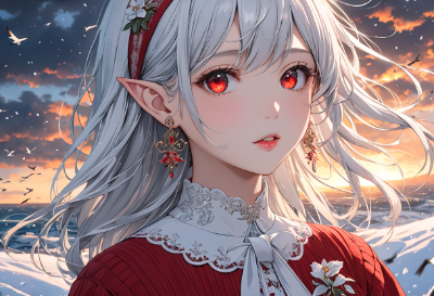 lying in bed,4K,8K,((masterpiece,best quality,Ultra extremely detailed,perfect anatomy,detailed,high resolution,highres,extremely detailed)),((close-up head,flower print,children female elf wearing see-through black blouse dress ,see-through sleeves, white_Tight_skirt:1.5,white gloves,red jumper blouson)),looking at viewer,((red Eye, Eye Reflections, reflect strong highlight in eyes)),waving shining long inner color white hair,hair_band,red Eye,elf ear with big earrings,opening mouth,mile,blush,lipstick,full fresh lips,big hip,small breasts,white knitted hat,earrings,BREAK,in bed,many birds,clouds,dark clouds,flushing lightning,snow field,strong wind,near sea,sunrise, <lora:hairdetailer:1> <lora:make25d_type1_v100:1>,