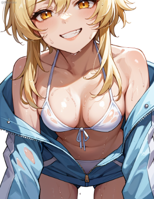score_9, score_8_up, score_7_up,source_anime, 1girl,(lumine_\\(genshin_impact\\):0.9), looking_back, medium_breasts, cowboy_shot, grin, wet, (white_bikini:1.2), string_bikini, side-tie_bikini_bottom, halterneck, hand_on_own_arm, from_below, from_behind,\nBREAK,\nblue_sky, day, cloud, sunlight,