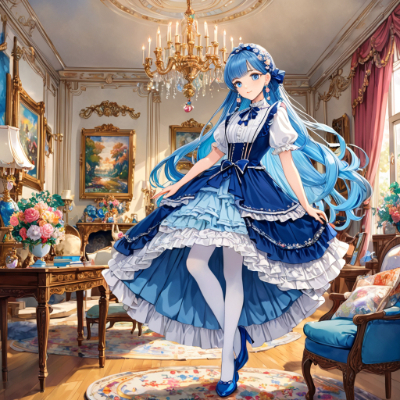 masterpiece,best quality,extremely detailed,anime,girl,skirt,princess,gradation color dress,white stockings,pumps,earrings,colorful,makeup,wink,fantasy,castle,blue hair,blue eyes ,garter belt <lora:hime_style-1.0r8:1> <lora:hairdetailer:1>,church,bobcut