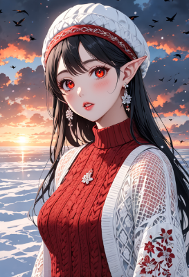((fisheye view camera)),bed,4K,8K,((masterpiece,best quality,Ultra extremely detailed,perfect anatomy,detailed,high resolution,highres,extremely detailed)),((close-up head,flower print,children female elf wearing see-through black blouse dress ,see-through sleeves, white_Tight_skirt:1.5,white gloves,red jumper blouson)),looking at viewer,((red Eye, Eye Reflections, reflect strong highlight in eyes)),waving shining long inner color white hair,hair_band,red Eye,elf ear with big earrings,opening mouth,mile,blush,lipstick,full fresh lips,big hip,small breasts,white knitted hat,earrings,BREAK,in bed,many birds,clouds,dark clouds,flushing lightning,snow field,strong wind,near sea,sunrise, <lora:hairdetailer:1> <lora:make25d_type1_v100:1>,,,