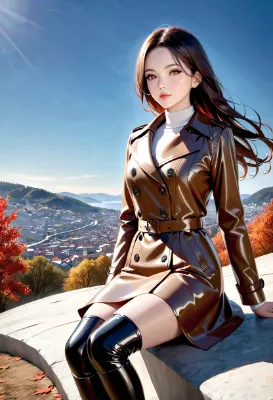(photorealistic:1.4), (RAW photo), masterpiece, best quality, extremely detailed, lady, neat and clean, elegant, shiny down jacket, flared skirt, enamel long boots, long hair, almond shaped eyes, smile, staring, dawn, early morning, sunrise, cape, lighthouse,