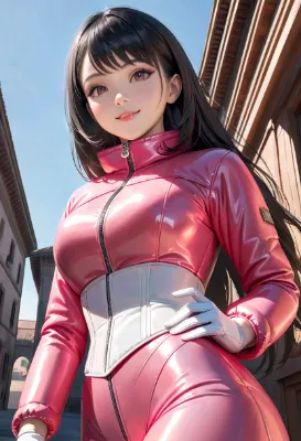 (photorealistic:1.4), (RAW photo), masterpiece, best quality, extremely detailed, lady, (enamel, rubber:1.2), shrine maiden, knee high boots, wedge sole, almond shaped drooping eyes, smile, staring, black hair, (low angle:0.7), <lora:hime_style-1.0r8:0.8>,