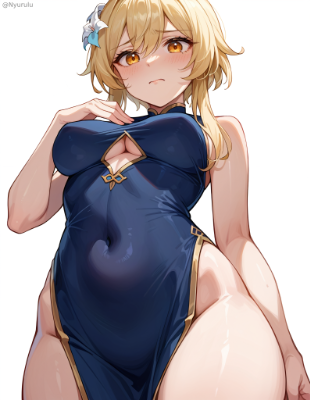 score_9, score_8_up, score_7_up,source_anime, 1girl,(lumine_\\(genshin_impact\\):0.9), looking_back, medium_breasts, cowboy_shot, grin, wet, (white_bikini:1.2), string_bikini, side-tie_bikini_bottom, halterneck, hand_on_own_arm, from_below, from_behind,\nBREAK,\nblue_sky, day, cloud, sunlight,