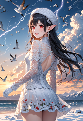4K,8K,((masterpiece,best quality,Ultra extremely detailed,perfect anatomy,detailed,high resolution,highres,extremely detailed)),((from back ,close-up hip,flower print,children female elf wearing see-through black blouse dress ,see-through sleeves, white_Tight_skirt:1.5,white gloves,red jumper blouson)),looking at viewer,((red Eye, Eye Reflections, reflect strong highlight in eyes)),waving shining long black hair,hair_band,red Eye,elf ear with big earrings,opening mouth,mile,smile,blush,lipstick,full fresh lips,big hip,small breasts,white knitted hat,earrings,BREAK,many birds,clouds,dark clouds,flushing lightning,snow field,strong wind,near sea,sunrise,<lora:hairdetailer:1> <lora:make25d_type1_v100:1>,,
