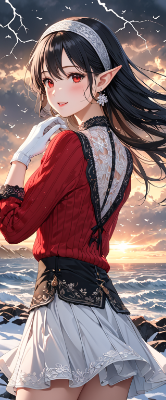 4K,8K,((masterpiece,best quality,Ultra extremely detailed,perfect anatomy,detailed,high resolution,highres,extremely detailed)),((from back ,close-up hip,flower print,children female elf wearing see-through black blouse dress ,see-through sleeves, white_Tight_skirt:1.5,white gloves,red jumper blouson)),looking at viewer,((red Eye, Eye Reflections, reflect strong highlight in eyes)),waving shining long black hair,hair_band,red Eye,elf ear with big earrings,opening mouth,mile,smile,blush,lipstick,full fresh lips,big hip,small breasts,white knitted hat,earrings,wet skin,drip,opening arms,BREAK,many birds,clouds,dark clouds,flushing lightning,snow field,strong wind,near sea,sunrise,<lora:hairdetailer:1> <lora:make25d_type1_v100:1>,,