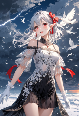 4K,8K,((masterpiece,best quality,Ultra extremely detailed,perfect anatomy,detailed,high resolution,highres,extremely detailed)),((close-up hip,flower print,children female elf wearing see-through black shoulder-length dress dress with flill,see-through sleeves, see-through white Long gloves of nobility)),looking at viewer,((red Eye, Eye Reflections, reflect strong highlight in eyes)),waving shining long white hair_ with curly hair,((big red ribbon)),red Eye,elf ear with big earrings,opening mouth,smile,blush,lipstick,full fresh lips,big hip,small breasts,drip,open arms,BREAK,many birds,clouds,dark clouds,flushing lightning,snow field,strong wind,near sea,sunrise,<lora:hairdetailer:1> <lora:make25d_type1_v100:1>,,