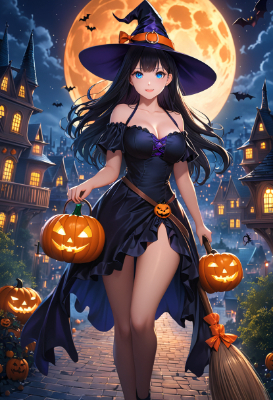 ribbon, masterpiece, best quality, high resolution, 8k, fantasy, witch, Halloween witch, pumpkin, broomstick, nighttime cityscape, moonlight, dynamic lighting, black hair, blue eyes, extremely fine and beautiful design, extremely fine and beautiful colors, surprising elements, wifemodel, amazing details