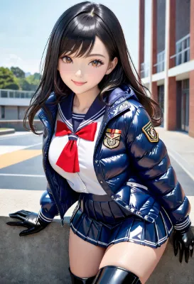 (photorealistic:1.4), (RAW photo), masterpiece, best quality, extremely detailed, girl, neat and clean, elegant, school uniform, navy pleated skirt, (leather jacket:1.3), red ribbon bow tie, black long boots, almond shaped eyes, shy look, smile, walk, commute, residential area, street, early morning, late autumn, early winter,