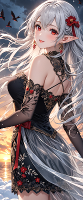 4K,8K,((masterpiece,best quality,Ultra extremely detailed,perfect anatomy,detailed,high resolution,highres,extremely detailed)),((from behind close-up her hip,flower print,children female elf wearing see-through black shoulder-length dress dress with flill,see-through tight skirt ,see-through sleeves, see-through white Long gloves of nobility)),looking at viewer,((red Eye, Eye Reflections, reflect strong highlight in eyes)),waving shining long white hair_ with curly hair,((big red ribbon)),red Eye,elf ear with big earrings,opening mouth,smile,blush,lipstick,full fresh lips,big hip,small breasts,drip,hiding own breast,BREAK,4K,many birds,clouds,dark clouds,flushing lightning,snow field,strong wind,near sea,sunrise,<lora:hairdetailer:1> <lora:make25d_type1_v100:1>,,