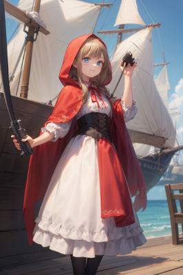 masterpiece, best quality, extremely detailed, anime, a girl, German, light brown hair, braids, blue eyes, smugness, lolita fashion, little red riding hood, cape, wearing a red hood, red colored big ribbon around the neck, white dirndl, brown corset, long skirt, standing, on ship deck, old-fashioned cannon, shipboard gun, blue sky, Caribbean, medieval sailing ship, middle ages, age of discovery <lora:yawanuri:1> <lora:hairdetailer:1>