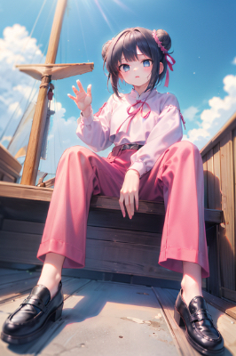 masterpiece, best quality, extremely detailed, anime, full body shot, a girl, short, lolita, black hair, short hair, 2bun hair, pink colored big ribbon, black eyes, narrow eyes, sulking, completely pink kung fu clothes, completely pink kung fu pants, black loafers shoes, kung fu pose, blue sky, caribbean, sea, medieval sailing ship, on deck, middle ages, Age of Discovery <lora:yawanuri:1> <lora:hairdetailer:1>