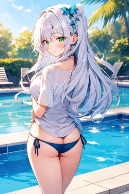 “Draw a beautiful idol crouching on a cute float ring by the poolside, laughing joyfully. She is wearing a cute bikini and a pareo. Her lustrous long white hair flows softly. Her large, beautiful eyes are green. The illustration should use thin lines with vivid, detailed colors. Focus on one character, showing her entire body from the front. The background is a poolside scene, and both the character and the background should be drawn with delicate illustration-style details, with the character centered.”,longhair,green eyes,evening sun