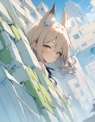 1girl, [satono diamond \(umamusume\)::1],[traditional media:1:5],partial upper body,solo,[(preteen female,dainty body type:1.3):1:15],[blonde hair:1:10],pleated skirt,[neck ribbon:1],[action::2],masterpiece, best quality,BREAK,,,,[light smile::5],[outdoors,urban landscape,gradient sky,ruins:1],[aerial perspective,foreshortening:5],[(sketch,unfinished:1.2):0.5],[( slender:1.2)::3],(fox ears:1.2),Medium hair,