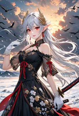 4K,8K,((masterpiece,best quality,Ultra extremely detailed,perfect anatomy,detailed,high resolution,highres,extremely detailed)),((close-up head,flower print,children female elf wearing see-through black shoulder-length dress dress with flill,see-through tight skirt ,see-through sleeves, see-through white Long gloves of nobility)),looking at viewer,(white eyepatch ),((Stinking red Eye)), Reflections reflect strong highlight in eyes,waving shining long white hair_with curly hair,(big red ribbon),Stinking red Eye,elf ear with big earrings,opening mouth,smile,blush,lipstick,full fresh lips,big hip,small breasts,BREAK,KATANA,4K,eyepatch,many birds,clouds,dark clouds,flushing lightning,snow field,strong wind,near sea,sunrise,<lora:hairdetailer:1> <lora:make25d_type1_v100:1>,,,,
