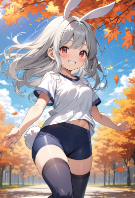 (An anime-style CG scene), small girl, black hair, hair in pigtails, pale brown eyes, (drak blue buruma), buruma, white shirt, short sleeve, black knee-high socks, anxious look, soft blue eyes, drooping eyes, blue sky, sports festival, autumn, school playground, falling maple leaves, masterpiece, best quality, extremely detailed, Beautiful fingers, kawaii, squat down, looking at viewer <lora:deluster2:0.3> <lora:flat2:-0.4>