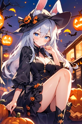 girl,bobcut,red hair,Stinking eyes,ojou-sama,original character,fantasy,steampunk,plant,autumn,different world,festival(The bewitching and beautiful girl with rabbit ears has a dissatisfied look on her face. She attended the Halloween festival during the autumn harvest festival in a flashy Halloween costume, but the Halloween costumes of the others were even more flashy, so she stared at them with a dissatisfied look.)