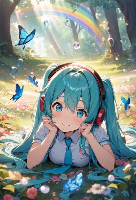 masterpiece, best quality, extremely detailed, anime, girl, skirt,mini skirt,twintail,longhair,blue hair,red hair,blue eyes,Stinking eyes,Hatsune Miku, vocaloid, 1 girl, twin tails, long hair, blue hair, green hair, blue eyes, necktie, headphones, smiling Hatsune Miku lies down in a field of flowers in the woods where sunlight shines through the trees. Blue butterflies are flying. A rainbow hangs over the clear blue sky. soap bubbles,