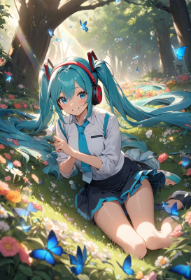 masterpiece, best quality, extremely detailed, anime, girl, skirt,mini skirt,twintail,longhair,blue hair,red hair,blue eyes,Stinking eyes,Hatsune Miku, vocaloid, 1 girl, twin tails, long hair, blue hair, green hair, blue eyes, necktie, headphones, smiling Hatsune Miku lies down in a field of flowers in the woods where sunlight shines through the trees. Blue butterflies are flying. A rainbow hangs over the clear blue sky. soap bubbles,