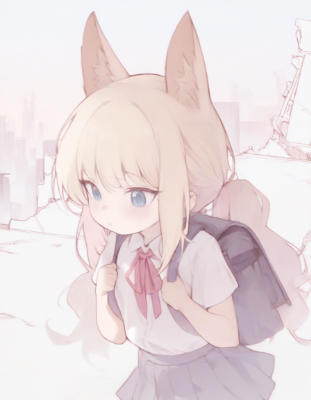 1girl, [satono diamond \(umamusume\)::2],[blue archive:1:5],partial upper body,solo,[(preteen female,dainty body type:1.3):1:15],[blonde hair:1:5],pleated skirt,[neck ribbon:1],[action::3],masterpiece, best quality,BREAK,,,,[light smile::5],[outdoors,urban landscape,gradient sky,ruins:1],[aerial perspective,foreshortening:5],[(sketch,unfinished:1.2):0.5],[( slender:1.2)::3],(fox ears:1.2),Medium hair,[oekaki::5],tareme,[unusual angle::3]