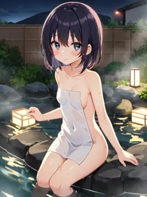 (onsen, unclear water, japanese hotspring, hot:1.2), winter evening, steam, wet hair:0.5, water reflection, naked,