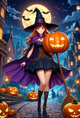 Highest quality, 8k, masterpiece :1.3, best quality, extremely detailed, amazing surprise, one woman, illustration, genius Halloween witch, autumn pumpkin, broom, fantasy, living pumpkin, living broom, nighttime cityscape, group procession, dynamic staging, movie lighting, extremely fine and beautiful design, extremely fine and beautiful colors, amazing, moonlight, <lora:saturation:1>, <lora:make25d_type4_v100:1>