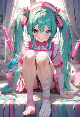 masterpiece, best quality, extremely detailed, anime, girl, ,Hatsune Miku, vocaloid, 1girl, twin tails, long hair, blue hair, green hair, , blue eyes, blue eyes, smiling Hatsune Miku wearing pink nurse clothes with a large syringe. I have pink bandages on my cheeks. A colorful bandage is attached to the foot.,skirt,mini skirt,twintail,longhair